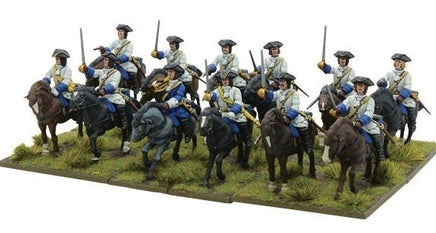 - 12 plastic cavalry including officer, bugler and optional standard bearer. Options for cuirassiers, dragoons, horse grenadiers and line cavalry regiments.