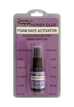ICKYSTICKY Foam Safe Activator is a single component, solvent based surface accelerator designed to increase the speed cure of ICKYSTICKY FOAM SAFE CA HOBBY GLUE. Forming strong bonds on most materials including foams and plastics, ICKYSTICKY FOAM SAFE ACTIVATOR increases gap filling and forming compatability.