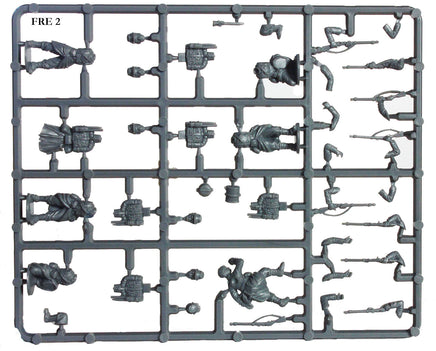 This box contains parts to assemble a firing line of 25 standing and kneeling figures plus 10 in advancing poses. There are also 3 command figures to make up a box of 38 miniatures plus casualties.