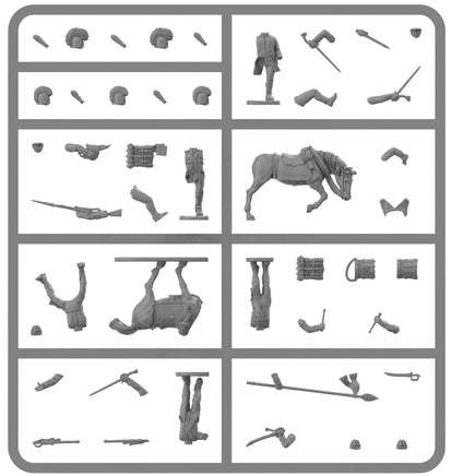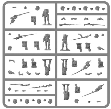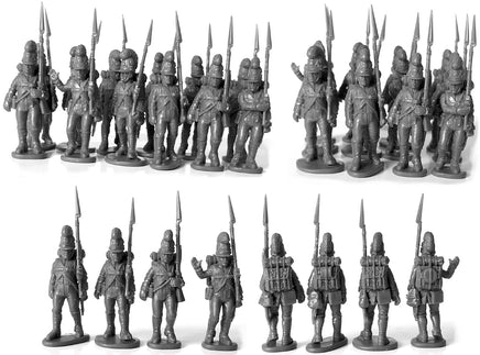 This set includes 58 highly detailed figures. These figures represent the Bavarian infantry from 1809, when they adopted more of a French style kit instead of the slung backpack and gaiters.