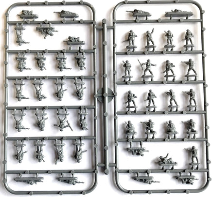 You can field a whole infantry company 1/1 ratio with each set as they contain enough riflemen, light machine guns, mortars, heavy machine guns, anti-tank weapons, radio operators, officers, sergeants and ammo carriers. They are one-piece castings as much as possible but some weapons such as Mortars and heavy Machine guns come in easy assemble multiple parts.