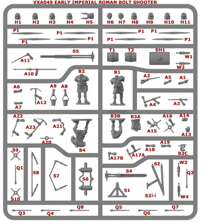 - 16 x crew figures in various poses. Ratcheting back the hand cranks, loading the bolts, standing guard. We even have arms with picks, axes and buckets so you can use them as Romans building and entrenching.