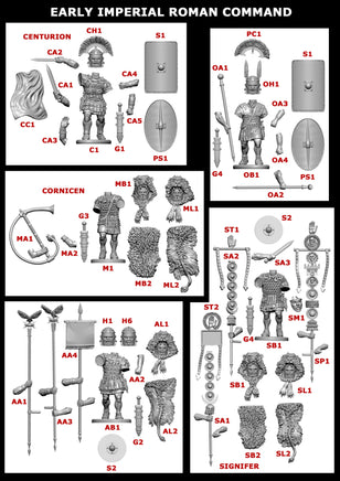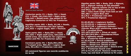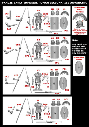 This set includes 25 highly detailed 28mm miniatures. The Early Imperial Roman Legionaries Advancing contains a myriad of additional weapons and armour, allowing for hundreds of different options when building the figures. Oval scutums and transverse crests included so that you can build your force as Praetorian Guard.