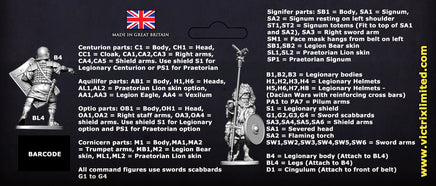 This set contains numerous head options with reinforced helmets for the wars with Dacia, shields and crests for Praetorias. Shields and crests can be customised to your liking with the LBMS shield transfer range.