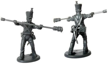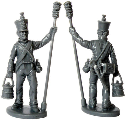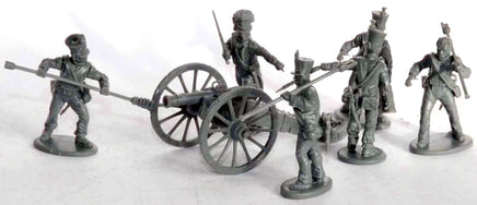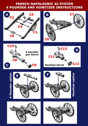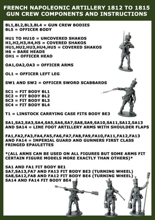 The set contains 3 guns based on the XI system with options for 6 pounder or howitzer barrels. The set contains 15 crew with multiple arm options including shoulder straps and fringed epaulettes (These are to represent master gunners). There are also many head options with uncovered and covered shakos.
