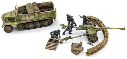 The kit comes with 4 x Sdkfz 11’s and 4 x Pak 40 antitank guns. There are two gun crews. 1 set in standard uniform and 1 crew in smocks. There are crew for the back of the halftrack and plenty of stowage and ammo boxes and spent shells. We have also included sand bags to help secure the gun emplacement.