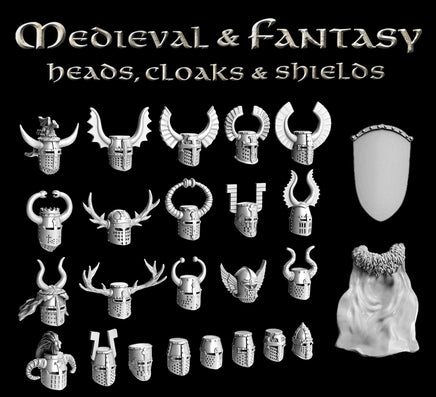 A Medieval/Fantasy conversion sprue containing heads, cloaks and shields, for all your conversion desires!Ā