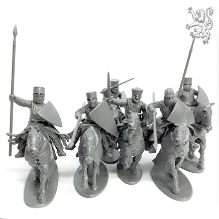 Movement and dynamism as well as accuracy and detail was a prime objective with this set. You can see from the leans in the saddle, to the raised and dipped shoulders wielding their variety of weapons, and their billowing surcoats and barding on the charging horses that this has been the end result.