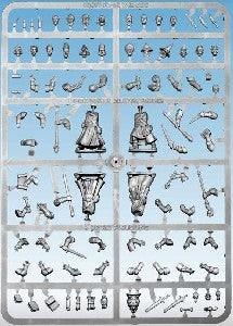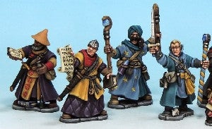 This boxed set offers enough parts to build eight wizards or apprentices for Frostgrave. It includes a wide range of heads, arms, equipment, and familiars, and is also compatible with the Soldiers, Cultists, and Barbarians boxed sets.