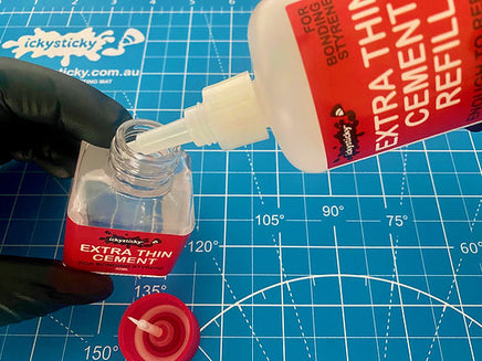 ICKYSTICKY EXTRA THIN CEMENT REFILL is a solvent based adhesive formulated to bond polystyrene plastic, commonly used in making plastic model kits. Also perfect for using on styrene sheets when creating unique and one-of-a-kind pieces.