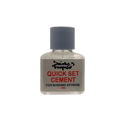 ICKYSTICKY QUICK SET CEMENT is a solvent based adhesive formulated to bond polystyrene plastic, commonly used in making plastic model kits. Also perfect for using on styrene sheets when creating unique and one-of-a-kind pieces.