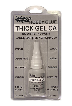 ICKYSTICKY Thick Gel CA is specially formulated to work on vertical and inverted surfaces. Bonds porous and non-porous materials.