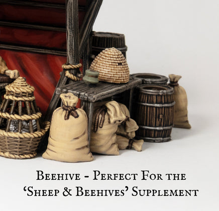 The barrels, pottery, furniture, and tools all take cues from authentic designs from foldable market stalls and sturdy feasting tables to clay furnaces, baskets, and sacks of grain. Even the poultry basket is based on period examples, made to hold a hand-painted chicken.Ā
